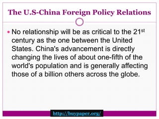 The document discusses US-China foreign policy relations and decision making processes. It examines the relationship between the two countries across several issues including security, currency exchange, financial matters, and human rights. It also analyzes cultural differences between China and the US that influence their relationship, as well as political ideologies like neoconservatism that shape US foreign policy approaches toward China. Containment versus engagement strategies for China's rise are also debated. Overall, the relationship remains complex due to differing political systems between the US and China.