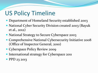 The document outlines the timeline of key US cybersecurity policies and initiatives from 2003 to 2013, including the establishment of the Department of Homeland Security and the National Cyber Security Division. It discusses how power relationships within the US government have affected cybersecurity policy, and the effects of episodic, social, and system power circuits. Issues identified with US cybersecurity efficacy include a lack of clear leadership, competing priorities, an unurgent threat perception, and insufficient private sector support and resources. The document proposes improvements such as designated cybersecurity leadership, increased regulation and training, improved information sharing, and public-private partnerships.