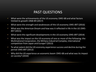 The document discusses the sources and factors influencing the U.S. economic boom from 1945 to 1989, including the impact of World War II, public investment, and changes in demographics. It highlights key events such as the Korean War, Vietnam War, oil crises, and Reaganomics, which shaped economic conditions and policies during this period. The text also examines multinational expansion and the military-industrial complex as significant elements of economic development.