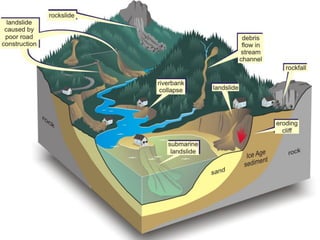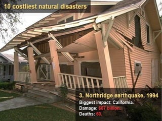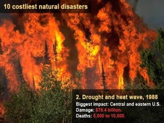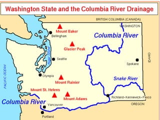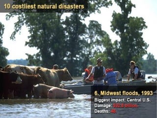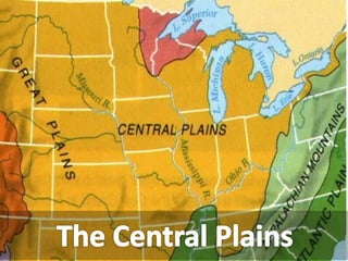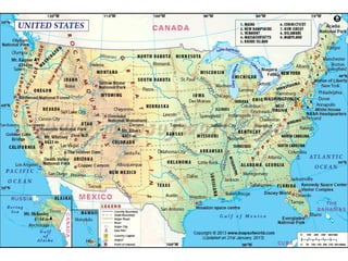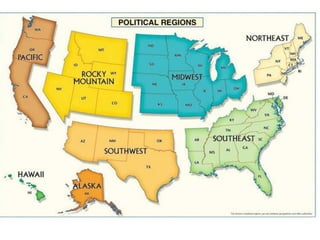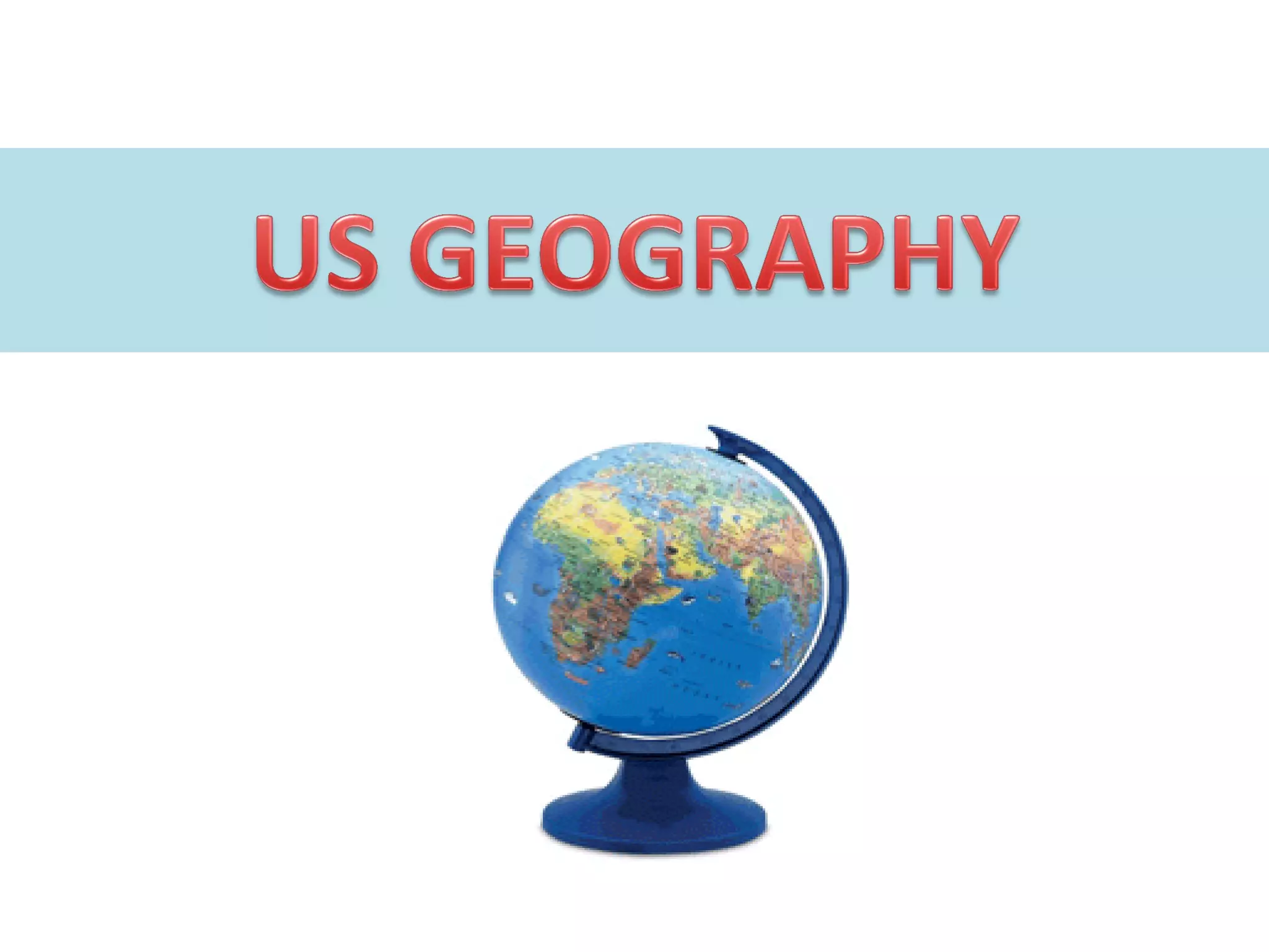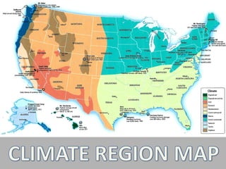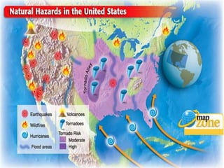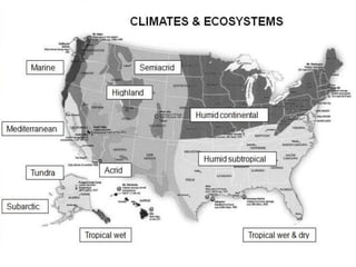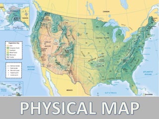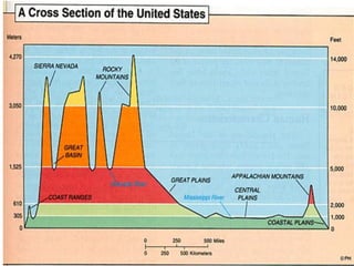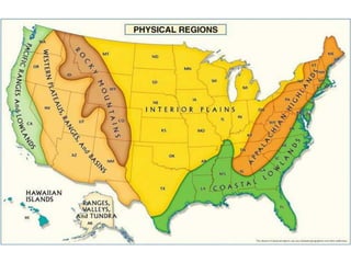 The document discusses the various geographic features of the United States, including its mountain ranges, coastal plains, climate regions, and water features. It describes the Pacific region's mountainous terrain with volcanic peaks, the Interior West's basins and ranges, the Appalachian Mountains, and the Interior Lowlands. The climate is influenced by latitude, altitude, ocean currents, and proximity to water. Natural resources provide benefits but also challenges from hazards.