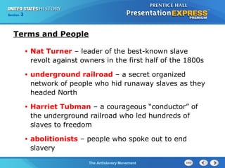 This document discusses the growth of the antislavery movement in the United States during the 1800s. It describes the lives of enslaved people and the leaders and activities of abolitionists who opposed slavery, such as William Lloyd Garrison, Frederick Douglass, and Harriet Tubman. While some abolitionists used nonviolent protest and civil disobedience, the movement faced significant resistance from those who argued slavery was important to the Southern economy. The growing abolition movement highlighted divisions between the Northern and Southern states on the issue of slavery.