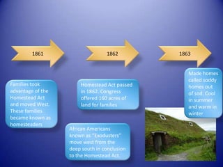 The document provides a timeline of key events in 19th century U.S. history from 1861-1896. It covers topics like the Homestead Act of 1862, the transcontinental railroad completion in 1869, inventions like the telephone and light bulb in the 1870s, and events such as the Wounded Knee Massacre in 1890. The timeline presents these historical developments in a brief but chronological format.