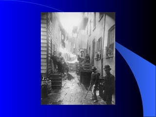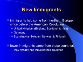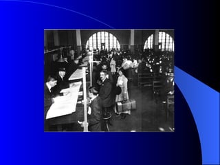 The document discusses immigration to the United States in the late 19th/early 20th century. During this period, most immigrants came from southern and eastern Europe as well as the eastern Mediterranean rather than previous sources of northern Europe. People left these areas due to overpopulation, lack of jobs, and mistreatment by governments. America offered jobs, opportunity, and freedom. Many immigrants passed through Ellis Island where they underwent health screenings and processing before settling across the United States, often where family or jobs were located.