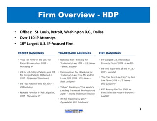 1) HDP is the 10th largest US IP firm with over 110 attorneys across four offices. In 2018 it obtained the 6th highest number of utility patents.