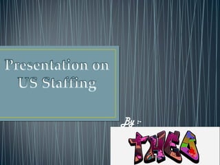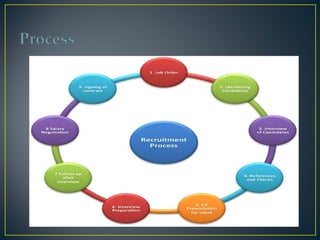 Staffing is the process of finding and attracting capable applicants for employment through various sources like direct applications, job portals, staffing agencies, newspapers, and campus recruitment. The staffing process involves collecting details about the job requirements and candidate information. There are two main types of staffing placements: permanent/full-time placements where the company hires the candidate directly, and temporary/contract placements where the candidate works for a contracting company but not the client company directly. Contracting/temporary placements are often shorter in duration and offer flexibility for both companies and candidates.