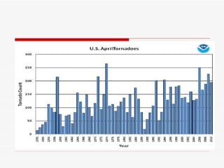 The document discusses tornadoes in the United States in 2010. It provides details on 1,531 reported tornadoes that year, with 45 confirmed fatalities. Several significant tornado outbreaks occurred between March and June 2010 across the central and southern US, causing widespread damage. Doppler radar technology has improved tornado warnings by detecting rotating storms.