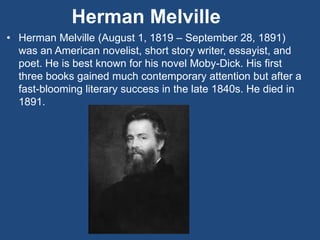 Herman Melville was an American novelist and poet best known for his novel Moby-Dick. Moby-Dick tells the story of a whaling ship called the Pequod and its captain's obsessive hunt for a giant white whale. Michael Jackson released the song "Black or White" in 1991 from his album Dangerous to promote racial unity. Michael Jackson was an American singer, songwriter, and dancer who was one of the most popular entertainers of all time. The New York Times is a major American newspaper founded in 1851 that is known for its slogan "All The News That's Fit To Print".