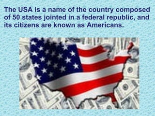 The document provides information about the history and geography of the United States, as well as some of its major attractions. It notes that the US is composed of 50 states and its citizens are known as Americans. It discusses the early European exploration and colonization of North America by Vikings and later by Columbus. Some key facts covered include the American Revolution, the Civil War, and the first moon landing. Major cities like Washington DC, New York, Boston, and Los Angeles are described along with some of their top attractions. Natural wonders like the Grand Canyon and national parks are also mentioned. The document concludes by discussing some children's attractions, especially Disney parks.