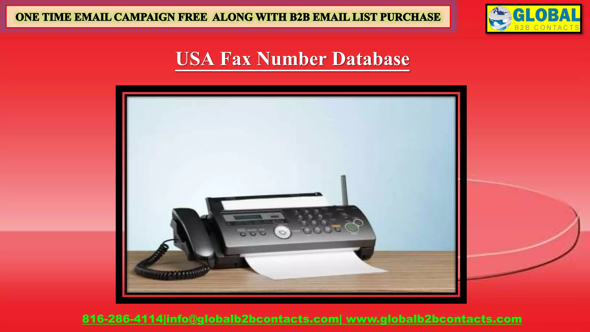 Global B2B Contacts provides a comprehensive USA fax number database designed for targeted multi-channel marketing campaigns. The database includes crucial information about qualified professionals, such as names, titles, company details, and verified email addresses, ensuring high accuracy and authority. They offer customizable options and guarantee delivery of data within 5 working days with a 95% accuracy rate.