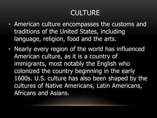 The document discusses various holidays and cultural observances in the United States. It describes national holidays like Independence Day and Labor Day, as well as religious holidays such as Christmas and Easter. Additionally, it outlines the influences of different immigrant groups on American culture, such as traditions brought from Europe and Africa. The summary provides an overview of the types of holidays covered and some of the main cultural influences discussed in the document.