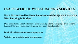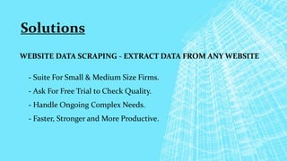 This document describes a range of web scraping services offered for various industries, including e-commerce, finance, healthcare, and real estate. It highlights data extraction capabilities for price monitoring, social media leads, job listings, and more, alongside features such as data cleaning and email verification. The company provides tailored solutions for both small and medium-sized firms, with options for a free trial to assess the quality of their services.