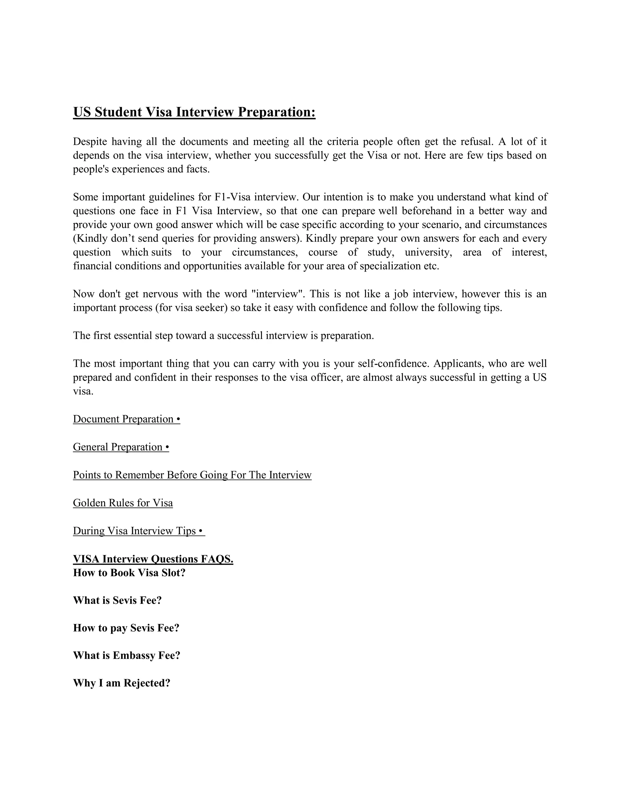 This document provides tips and guidelines for preparing for a US student visa interview. It emphasizes being well-prepared by researching common interview questions and one's own application details. Key recommendations include dressing professionally, maintaining eye contact with the officer, giving concise answers, and exhibiting confidence. Applicants should be ready to explain their need for the visa program, financial support plans, and intentions to return home after completing their education. Overall preparation, documentation, and positive attitude are emphasized as important factors for a successful interview.
