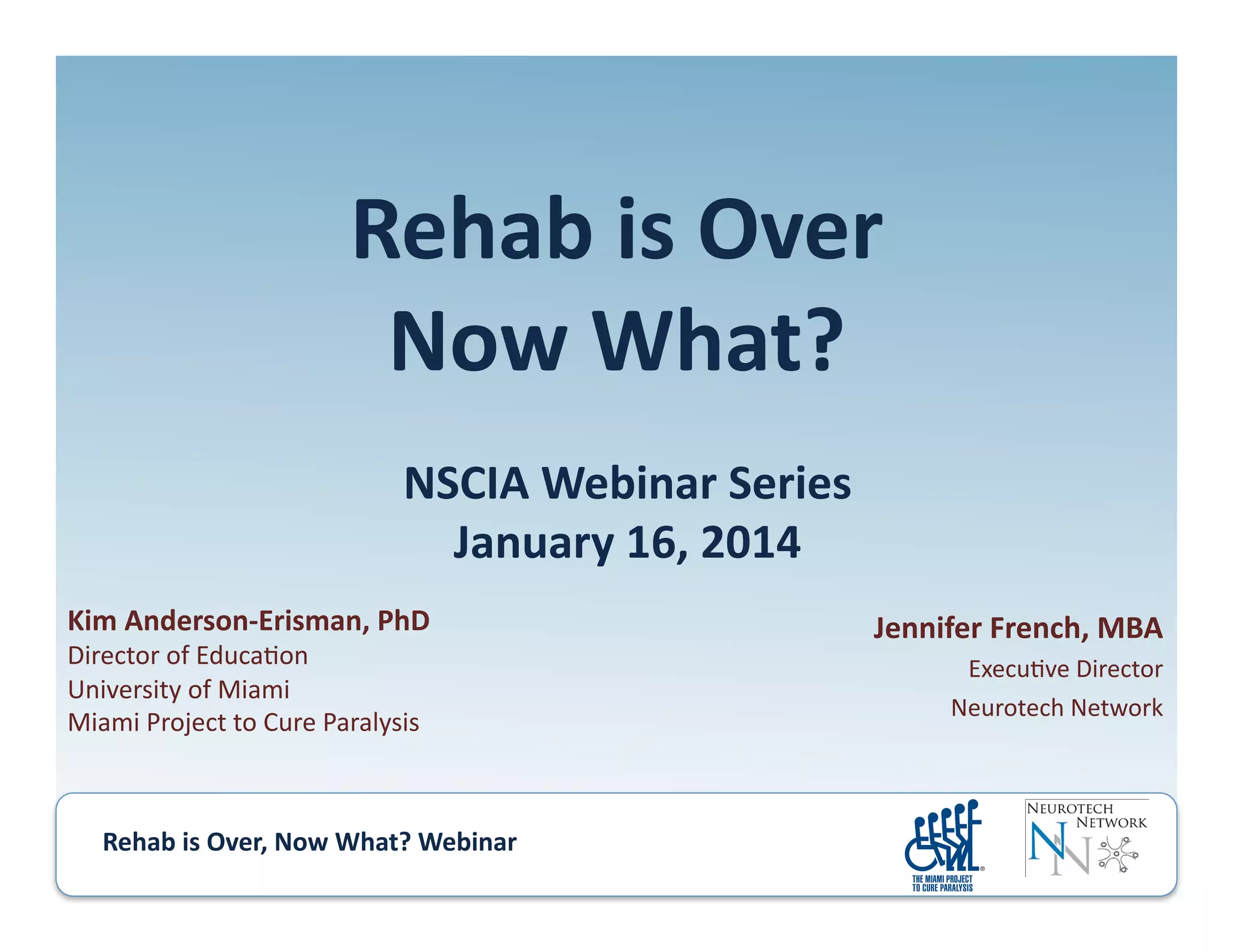 The webinar discusses options for exercise programs after rehabilitation is over for people with paralysis. It outlines the importance of continued exercise to prevent health issues. While most people feel exercise is important, over 60% do not have access to a trained therapist to oversee their exercise. Common barriers to exercise include lack of energy, motivation, time and knowledge of where to exercise. The webinar then presents different types of low-tech and high-tech options for exercise programs and questions to consider when looking for post-rehabilitation resources and support.