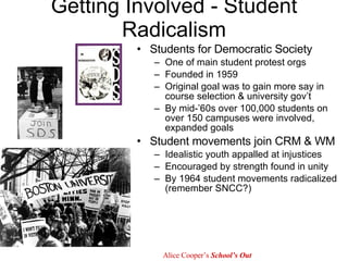 The student movement of the 1960s sought greater involvement in university governance and protested social injustices. Inspired by the civil rights movement, students organized around issues like racism, the Vietnam War, and sexism. Protests grew increasingly radical and widespread, with over 100,000 students involved across more than 150 campuses by the mid-1960s. The Vietnam War became a major rallying issue, sparking large demonstrations that sometimes turned violent as the decade progressed.