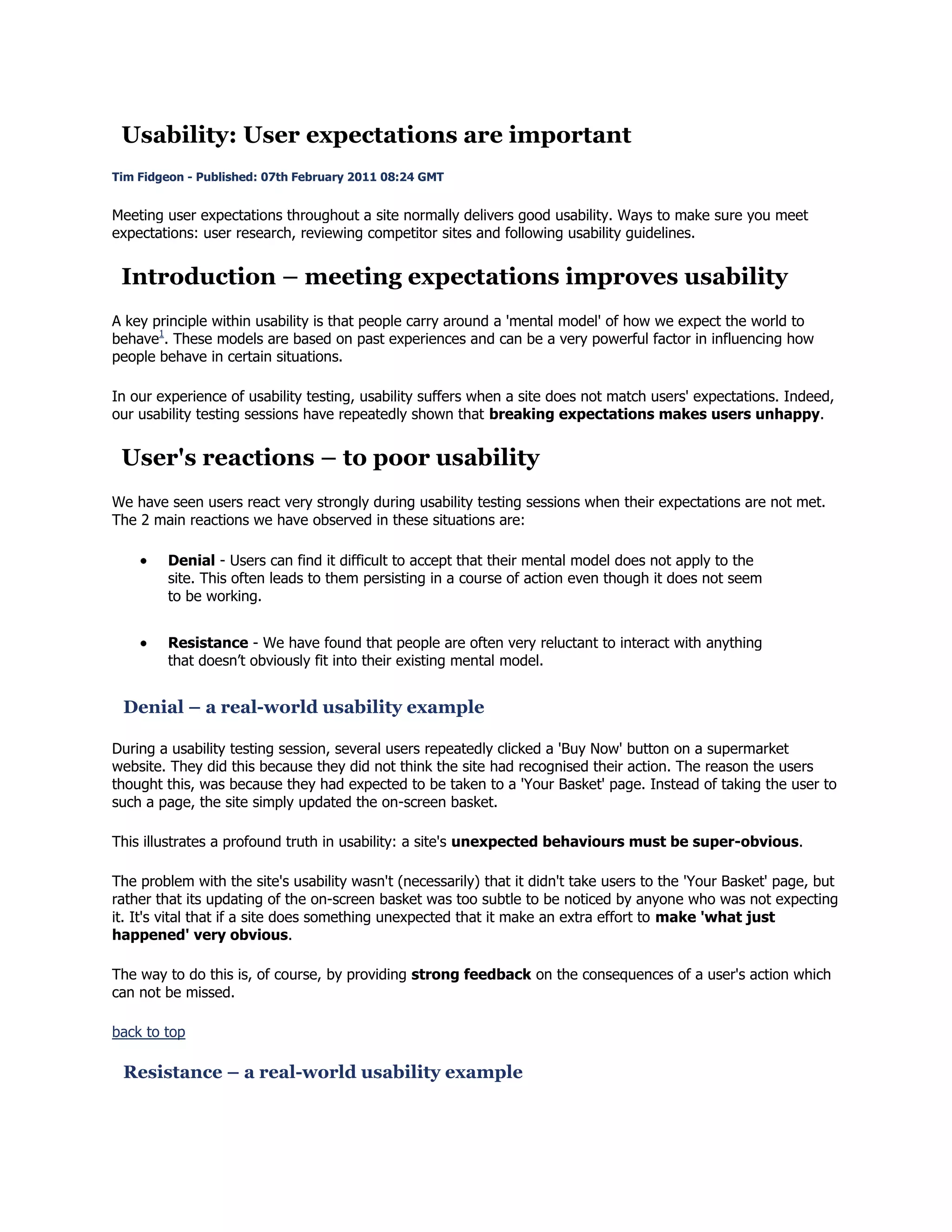 Meeting user expectations is important for good usability. User research, reviewing competitors, and following guidelines can help ensure expectations are met. When expectations are broken, users may deny the issue or resist interacting. For example, users repeatedly clicked "Buy Now" on a site that updated the basket instead of taking them to an expected "Your Basket" page, showing unexpected behaviors must be obvious. Resistance to change was also seen when users did not want to learn a new Office interface. A site's structure, behavior, language, and appearance should match user expectations to have good usability.