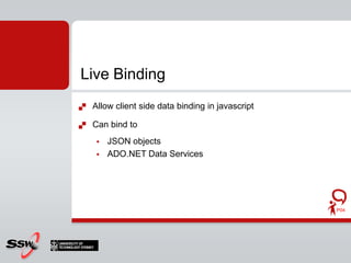 The document details a presentation by Peter Gfader on ASP.NET features and usability, covering topics such as AJAX for rich web applications, validation controls, and user experience improvements. It discusses enhancements in ASP.NET 4.0, SEO strategies for nicer URLs, and live data binding. Additional resources and tools for developers are also provided, aiming to enhance application performance and user interaction.