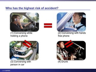 The document discusses the impact of usability in various contexts, particularly in healthcare technology, emphasizing the significant cognitive impairments caused by cell phone use while driving. It highlights user performance metrics, design implications, and recommendations for improving usability in user interfaces and form layouts. Key concepts include the importance of typography, eye tracking, and the psychological aspects of user interaction with technology.