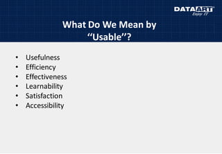 The document discusses usability testing and how to make products more usable. It defines usability and lists factors that contribute to usability such as usefulness, efficiency, and satisfaction. Non-integrated development and a focus on machines over users can reduce usability. Techniques for improving usability include user research, iterative design/testing, and heuristics for interface design. The document outlines methods for expert review and usability testing to identify and address usability issues.