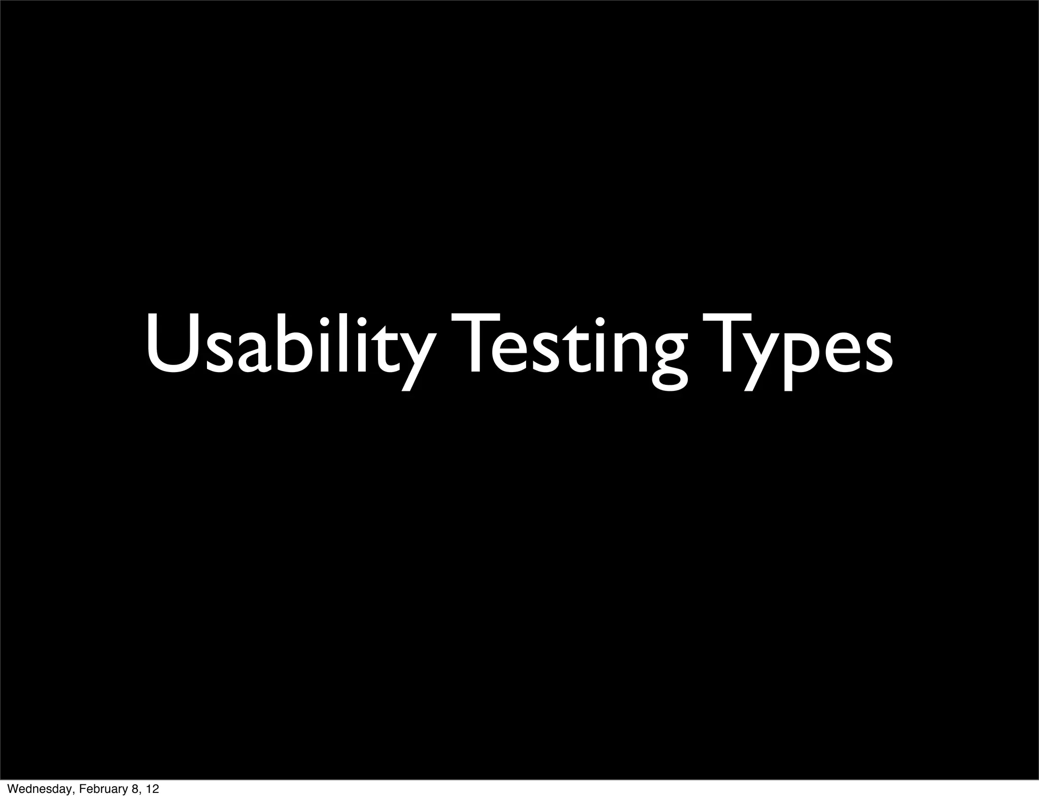The document discusses different types of usability testing, including exploratory/formative testing which aims to understand why users have difficulties, and assessment/summative testing which evaluates how well a system performs. It also covers iterative design, validation/verification testing, and comparisons between systems. Usability testing should use representative samples of end users, observe them in actual work environments, and include interviews and measurements of performance. The goal is to recommend improvements and ensure ethical treatment of human subjects.