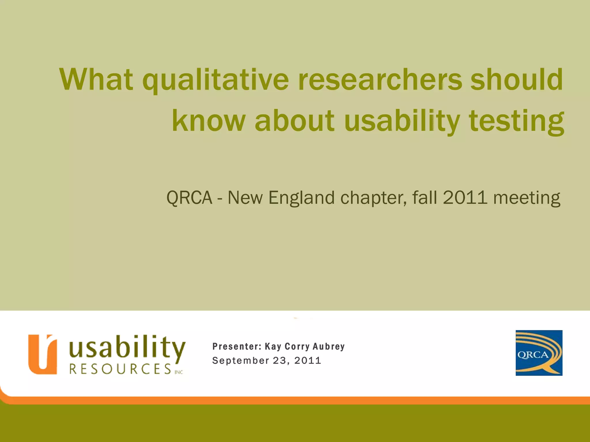 1. The document provides an overview of how to plan, run, analyze and report on a usability study. It discusses where usability testing fits in with other qualitative research methods and what can be tested.