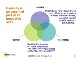 The document discusses usability testing and its importance in ensuring user satisfaction and productivity on websites. It outlines various methods and tools for assessing usability, emphasizing user-centered design and identifying user needs to improve navigation and content findability. Key benefits of usability testing include obtaining actionable results, aligning with best practices, and enhancing user trust and experience.