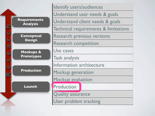 The document outlines the process of usability testing which involves planning tasks by identifying users and their needs, designing prototypes, conducting tests using methods like interviews and observations to evaluate the prototypes, and gathering feedback through post-session questionnaires to identify problems and improve the design.