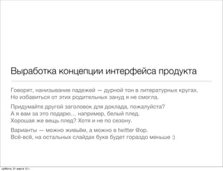 Документ представляет собой набор размышлений и обсуждений о процессе разработки интерфейса продукта, обращая внимание на важность вовлечения заказчика и понимания его потребностей. Автор освещает практические аспекты, такие как прототипирование и сбор требований, а также делится юмористическими нотками по поводу коммуникации. Также включены диалоги, иллюстрирующие ситуации, возникающие при выборе и тестировании продуктов.