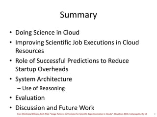 The document discusses the integration of cloud computing resources to enhance scientific experimentation, addressing the challenges of existing systems like long queue times and lack of transparency. It proposes a meta-scheduler that utilizes historical data to predict future job executions, thereby reducing startup overheads and improving resource utilization. The document also explores use cases in various scientific domains, demonstrating the significance of prediction accuracy on job execution efficiency.