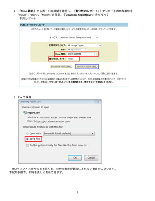 URL よりアカウント(請求&コスト管理「レポート」画面))にログインしてください。 https://console.aws.amazon.com/billing/home#/reports 2. 画面下「AWS 使用状況レポート」をクリック 3. 対象のサービスをプルダウンより選択してください。