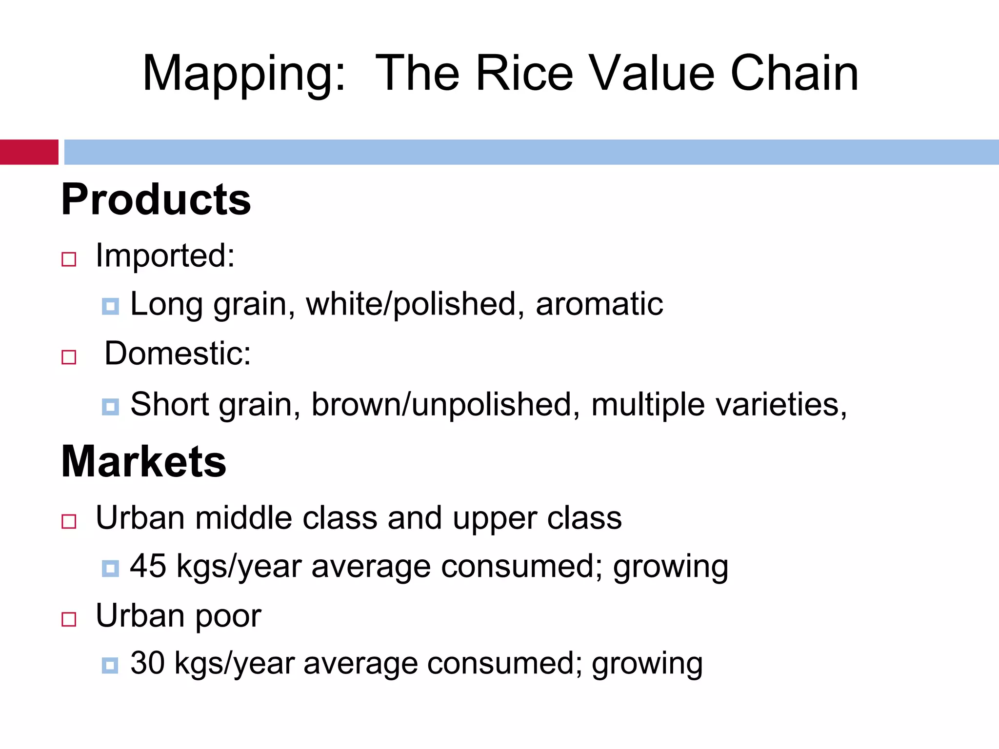 The document outlines the structure and function of the rice value chain system, emphasizing the importance of mapping functions and players within the system. It presents various factors influencing value chain performance and customer perceptions of rice characteristics between imported and domestic products. Additionally, it describes an exercise for participants to identify and position their roles within the interconnected systems of the rice market.