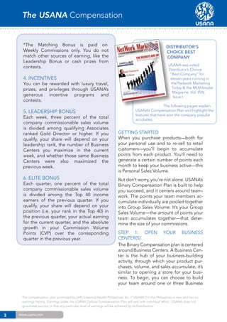 The document describes the compensation plan for USANA, a direct selling company. There are 6 ways to earn income: 1) retail sales profits, 2) weekly commissions from sales volume matching on the left and right sides of a business center, 3) lifetime matching bonuses for sales of sponsored associates who achieve certain status levels, 4) incentives like travel rewards, 5) leadership bonuses for high-ranking associates, and 6) elite bonuses for top earners. Associates can choose to open one or three business centers. Building teams by placing new associates on the left and right generates group sales volume, and commissions are paid when the left and right sides match based on a percentage of the smaller side.