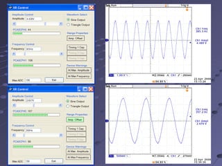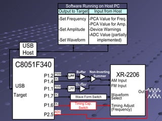 This document describes the design and implementation of a USB controlled function generator using a XR-2206 analog signal generator chip and a Silicon Labs C8051F340 microcontroller. Key features include programmable signal generation over a wide frequency range that can be controlled from a PC. The design provides advantages over a completely digital approach such as faster analog signal generation.