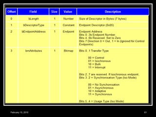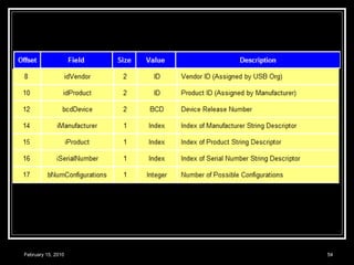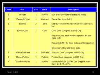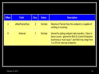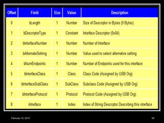- USB protocol layers, descriptors, endpoints, interfaces, and common packet fields.
