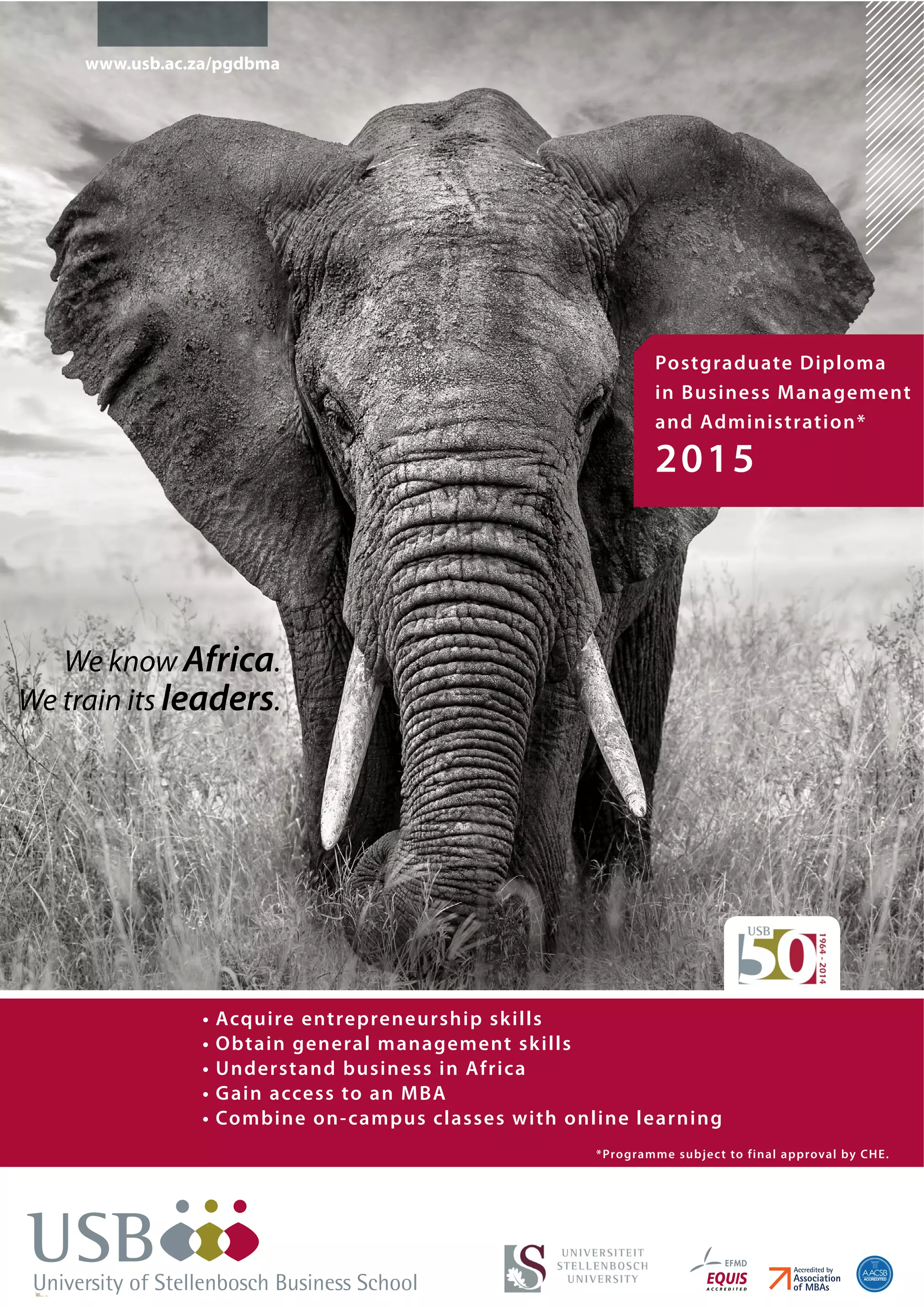 The document provides information about the Postgraduate Diploma in Business Management and Administration offered by the University of Stellenbosch Business School (USB) in South Africa. The one-year program can be completed through residential, mixed, or blended learning, allowing students to study while working full-time. It aims to develop general management skills with an entrepreneurial focus to prepare students for managerial roles or owning their own business. Graduates may qualify for entry into USB's MBA program or enhance their skills without pursuing a full MBA. The program combines classroom and online learning, offering flexibility to students.