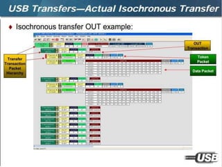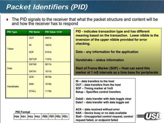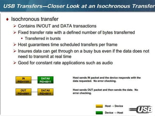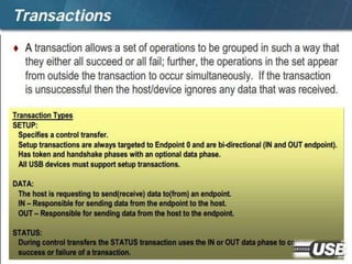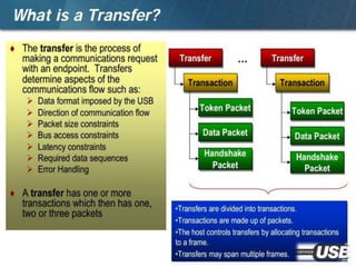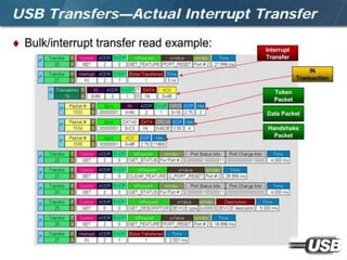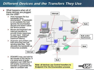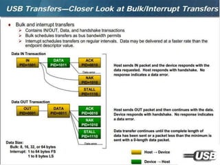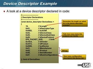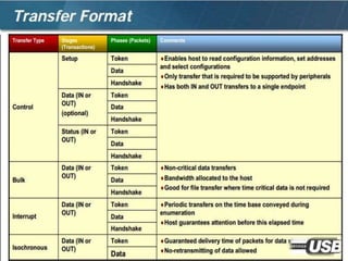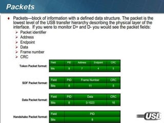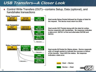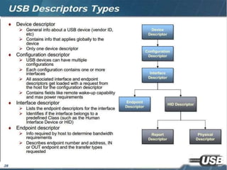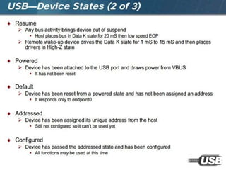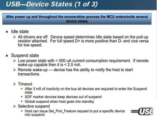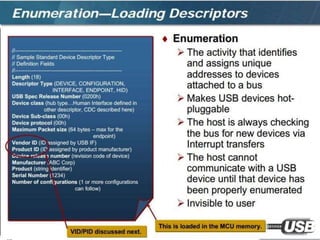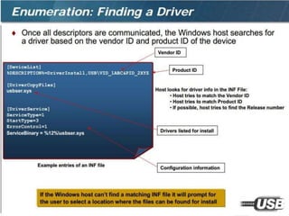 The document summarizes the USB standard and enumeration process. It discusses that USB was developed in the 1990s by major tech companies as a standard cable and protocol for connecting devices. The 12 step enumeration process is then outlined, beginning with a device attaching to a port, the hub detecting it, the host learning about it and assigning an address, retrieving descriptors to identify the device and load appropriate drivers, and ultimately selecting a configuration so communication can begin.