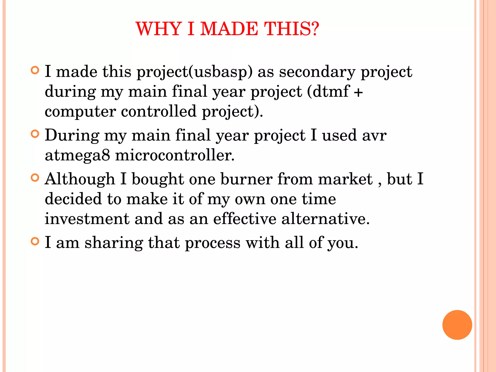 This document provides a 10 step process for making a USBASP programmer to program AVR microcontrollers. It discusses downloading the necessary software, burning the hex file to program the microcontroller, setting the fuses using AVR-Burn-O-Mat software, and connecting the circuit components according to the provided diagram. The goal is to create an inexpensive alternative for programming AVR chips using a USBASP circuit.