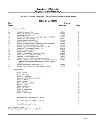 This document provides an organizational directory for the United States Department of Education. It lists contact information including phone numbers and office locations for various headquarters offices and regional offices. The mission of the Department is to promote student achievement and preparation for global competitiveness through educational excellence and equal access. Key offices listed include the Office of the Secretary, Office of the Deputy Secretary, Office for Civil Rights, and the Office of Special Education and Rehabilitative Services.