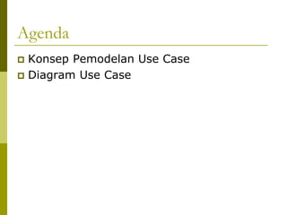 Dokumen ini membahas penggunaan diagram use case untuk mengidentifikasi elemen dan proses utama dalam sistem, menggambarkan interaksi antara aktor dan use case. Use case merepresentasikan fungsionalitas sistem, sedangkan aktor mewakili individu atau sistem yang berinteraksi dengan sistem tersebut. Selain itu, dijelaskan juga tentang relasi antara use case dan aktor serta perbedaan antara business use case dan use case biasa.