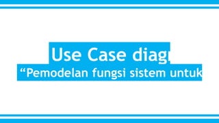 Dokumen tersebut menjelaskan tentang Use Case Diagram yang digunakan untuk memodelkan fungsi sistem untuk pengguna dengan tujuan mengidentifikasi fungsi-fungsi yang ada dalam sistem dan hubungan antara aktor dan fungsi tersebut. Komponen utama dari Use Case Diagram adalah aktor, use case, dan relasi antara aktor dan use case seperti asosiasi, generalisasi, dan dependensi.