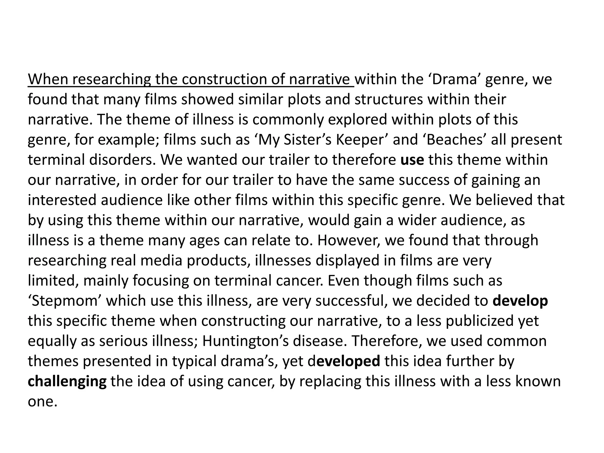 The document discusses how the media product challenges conventions of the drama genre in its narrative, characters, setting, and visual elements. It used common drama themes like illness but developed it by focusing on a less known disease than cancer. It challenged the typical domestic setting by having scenes outside. It conformed to some conventions like having a female protagonist but developed the character's age. It challenged stereotypes around costumes representing vulnerability by portraying the character as a normal teenager. It developed conventions of trailers by minimizing titles and including local production companies. It conformed to conventions of sound editing and shifts in music to represent changes in mood.