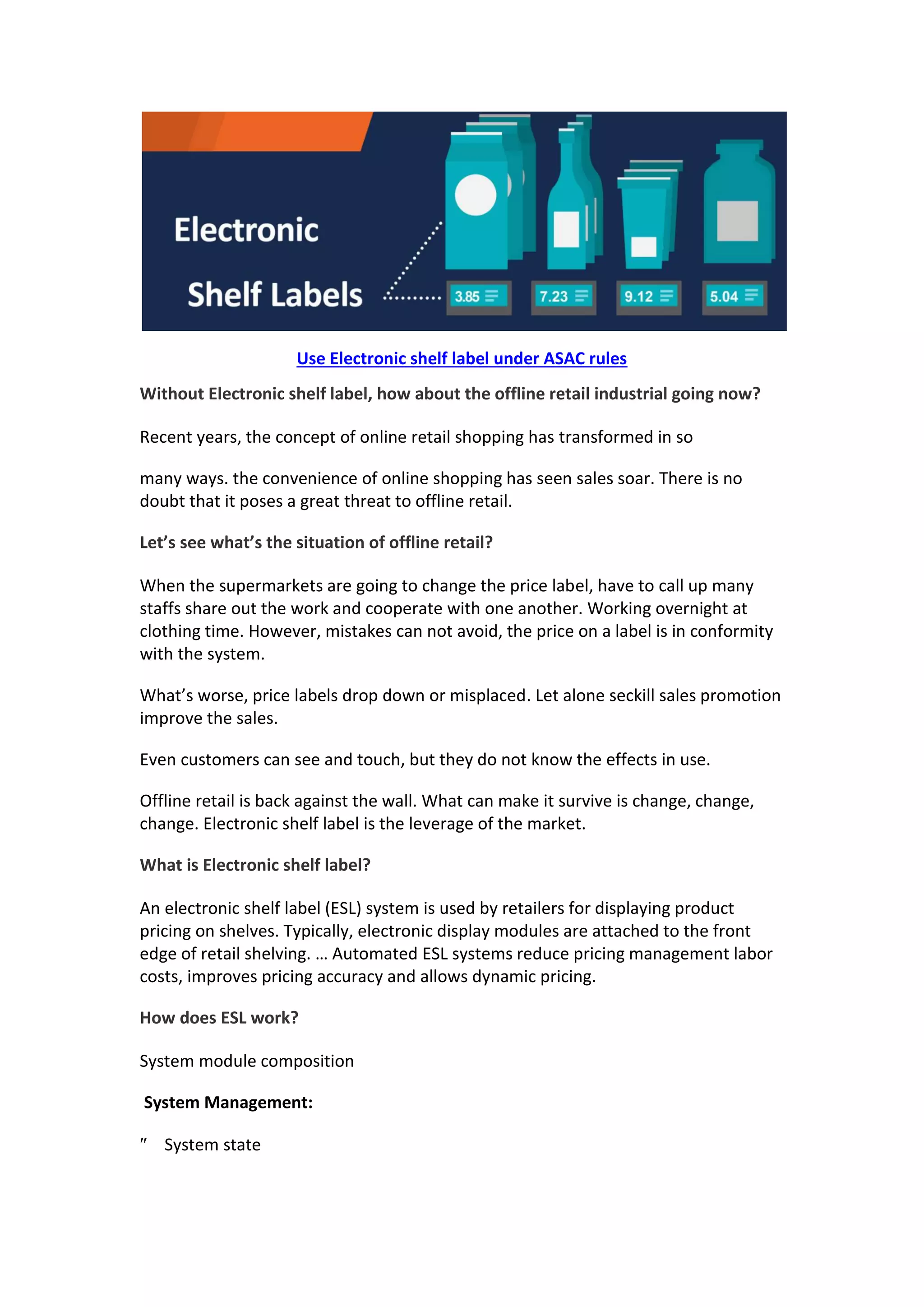 The document discusses the challenges facing offline retail due to the rise of online shopping and emphasizes the benefits of implementing electronic shelf labels (ESL) as a solution. ESLs facilitate real-time price updates, improve pricing accuracy, and enhance customer experience by displaying inventory and product reviews. It concludes that adopting ESL technology could help offline retailers survive and thrive by streamlining operations and leveraging data for better decision-making.