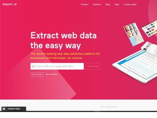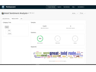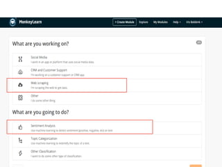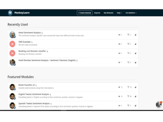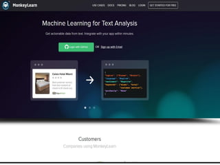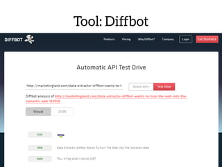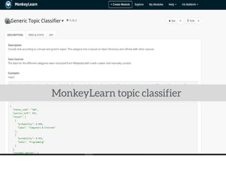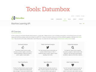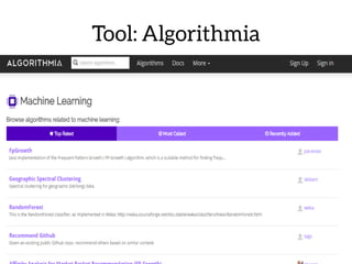 The document discusses the use of machine learning for predictive analytics, particularly in pricing predictions based on historical data, and emphasizes the importance of building useful rather than perfect models. It highlights various applications of machine learning including sentiment analysis, content classification, and the development of recommendation engines using pre-trained models. Resources for learning machine learning and practical applications in SEO and data scraping are also provided.