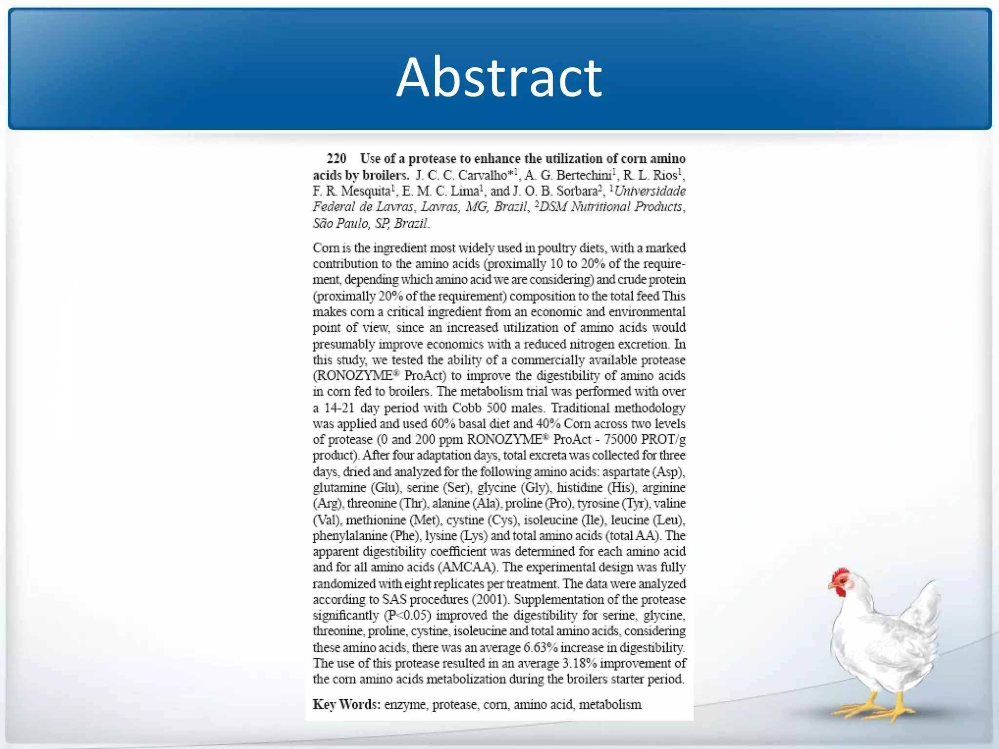The study tested the effectiveness of a protease, Ronozyme Proact, in enhancing amino acid digestibility in corn for broilers. Results showed a significant improvement of approximately 3.18% in total apparent amino acid digestibility when the protease was included in the diet. The research indicates that using 200 ppm of this protease can effectively increase the utilization of amino acids in corn-based diets for broilers.