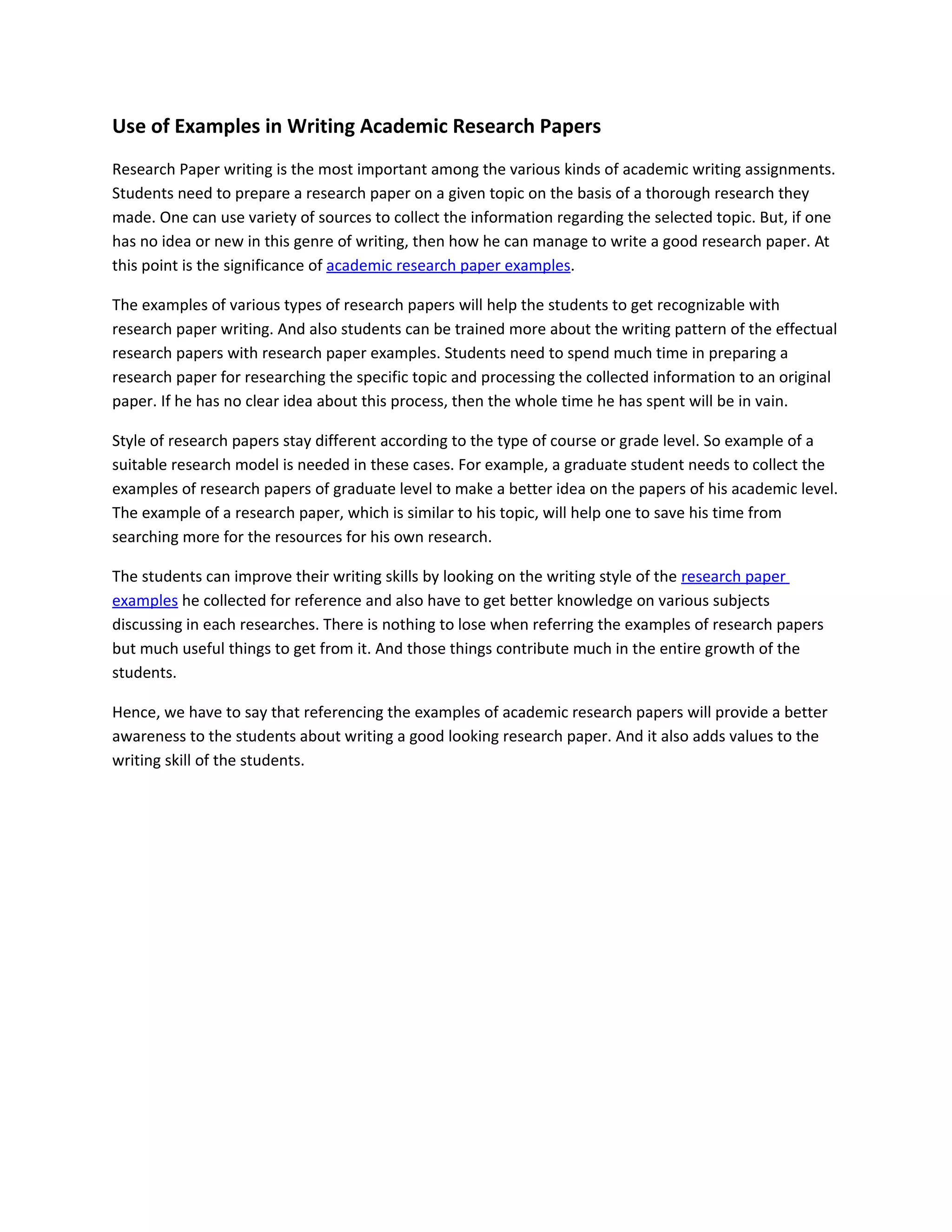 The document emphasizes the importance of using academic research paper examples for students to improve their writing skills and understanding of research paper composition. It highlights that these examples assist in familiarizing students with different writing styles and help them save time while researching their own topics. By referencing suitable examples, students can enhance their knowledge and develop effective research papers tailored to their academic level.