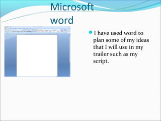 The document outlines various software and tools the author plans to use to complete their trailer project, including Microsoft Word to plan their script, Microsoft PowerPoint to plan character ideas, Microsoft Excel for a Gantt chart time management, SlideShare to convert PowerPoints, WordPress for their blog, a computer to do all work, Prezi for additional presentation tools, Photoshop to edit images, a Sony camera to film and take photos, the internet for research, and Schoology to access assignment details.