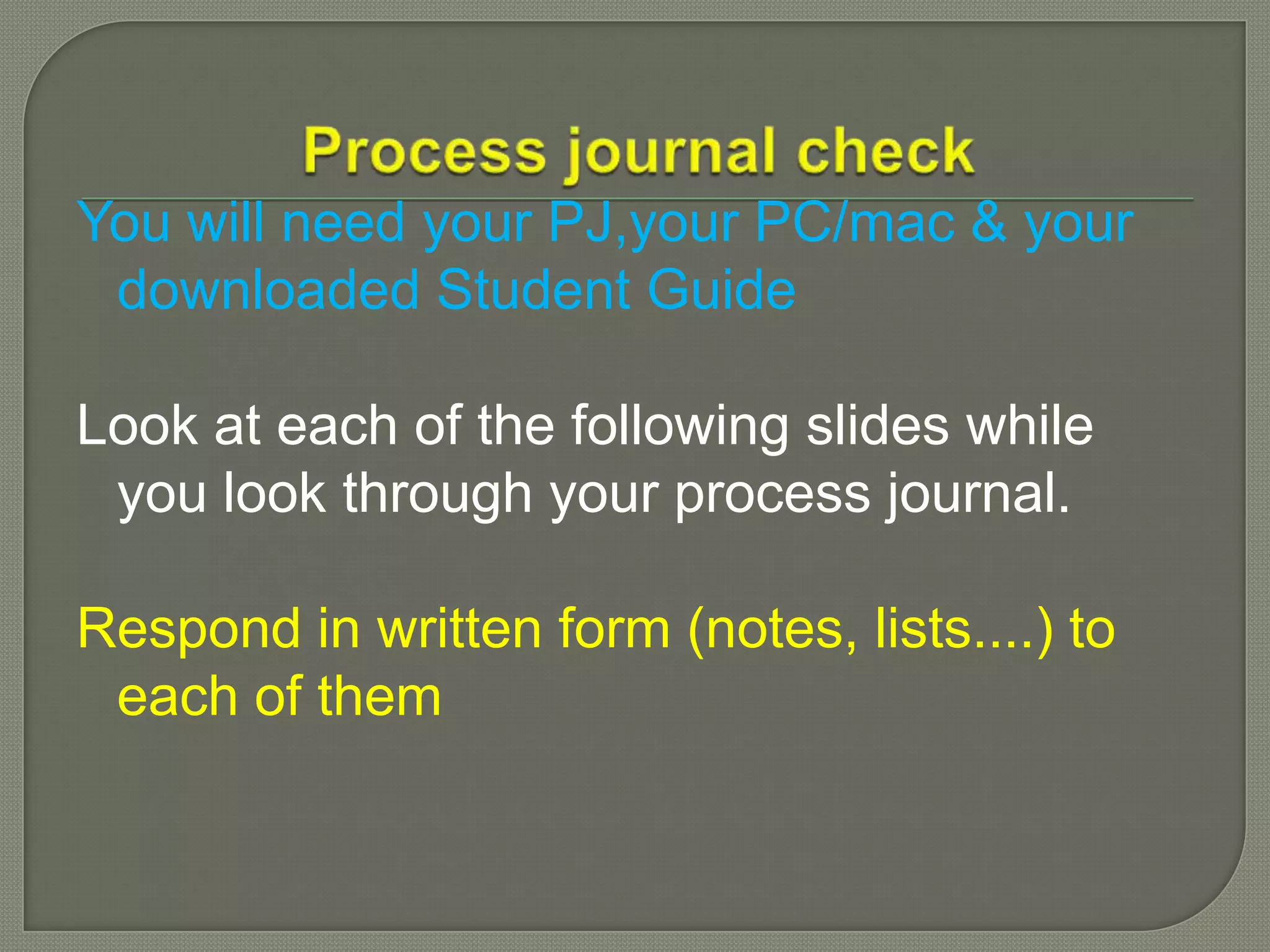 This document provides guidance for students on the process of developing an independent project for the International Baccalaureate Diploma Programme. It instructs students to review slides in their process journal that relate to approaches to learning, areas of interaction, and expectations for different subject groups. Students are asked to reflect on these areas in written form. The document then outlines specific tasks for brainstorming project ideas, meeting with supervisors, developing goals and specifications to evaluate their project, and identifying necessary resources and skills.