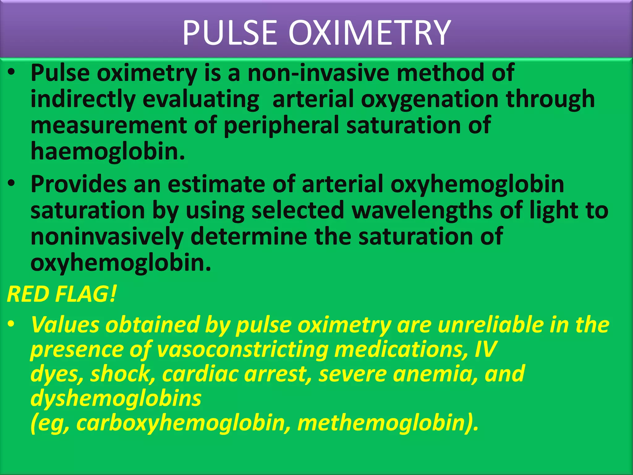 Pulse oximetry is a non-invasive method to estimate arterial oxygen saturation by passing light through tissue to measure oxygenated hemoglobin. It provides early detection of hypoxemia but values can be unreliable in certain conditions like shock or methemoglobinemia. Pulse oximetry is useful for monitoring critically ill patients, evaluating oxygen therapy effectiveness, and determining supplemental oxygen needs. Proper use requires cleaning areas and ensuring correct sensor placement and alignment.