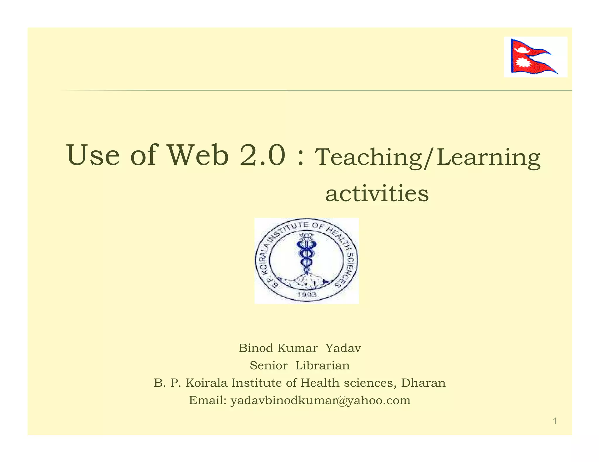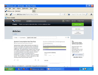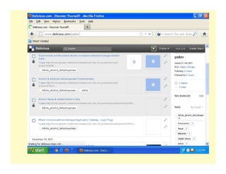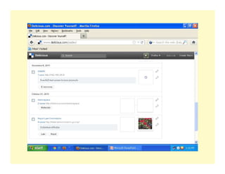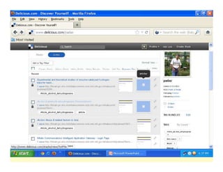 Web 2.0 allows for greater interactivity, collaboration, and sharing between users on the internet compared to earlier versions. It includes user-generated content, social media, and other platforms where users can interact. Social bookmarking tools like Delicious allow users to save, organize, and share bookmarks online for accessibility from anywhere. This enables collaboration, sharing of resources, and keeping track of new information.