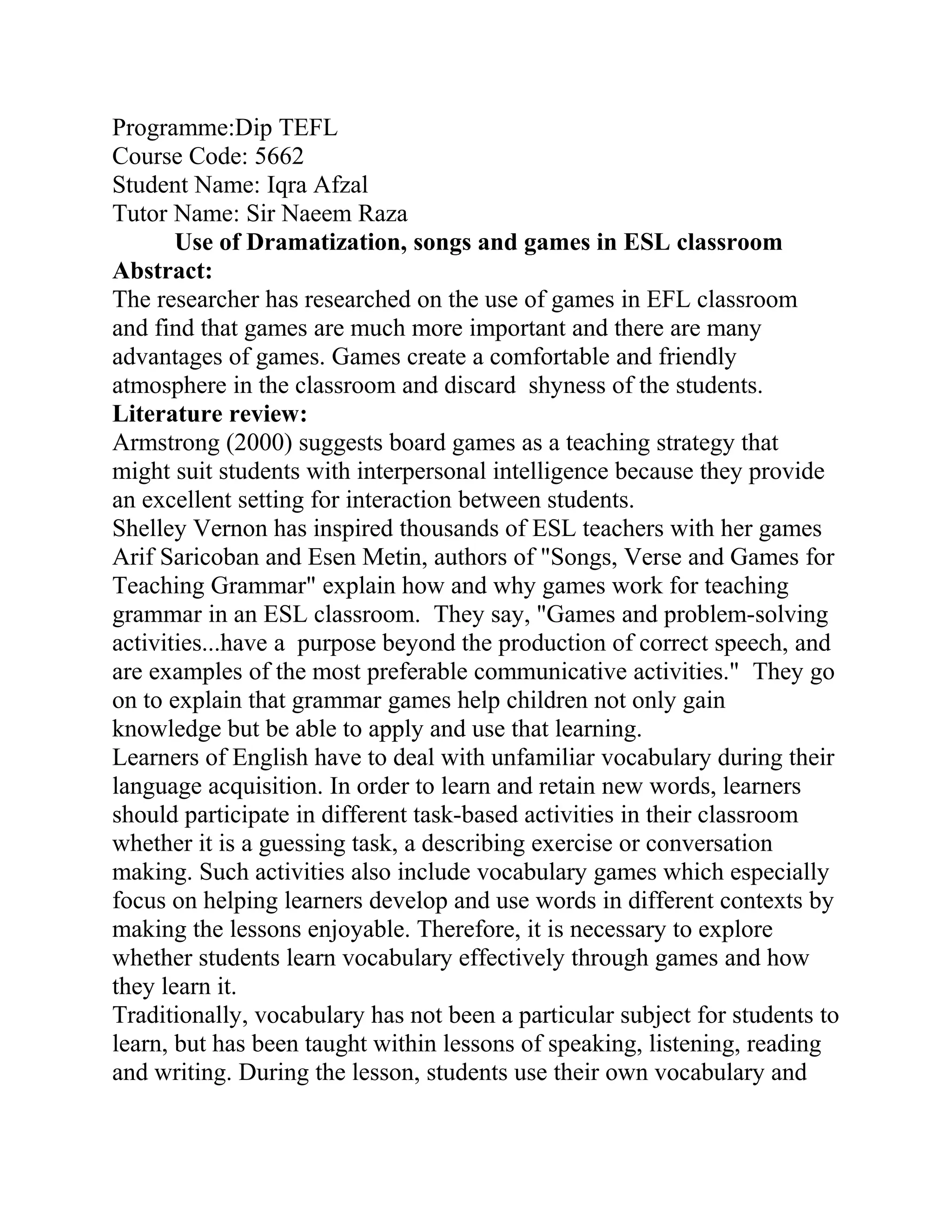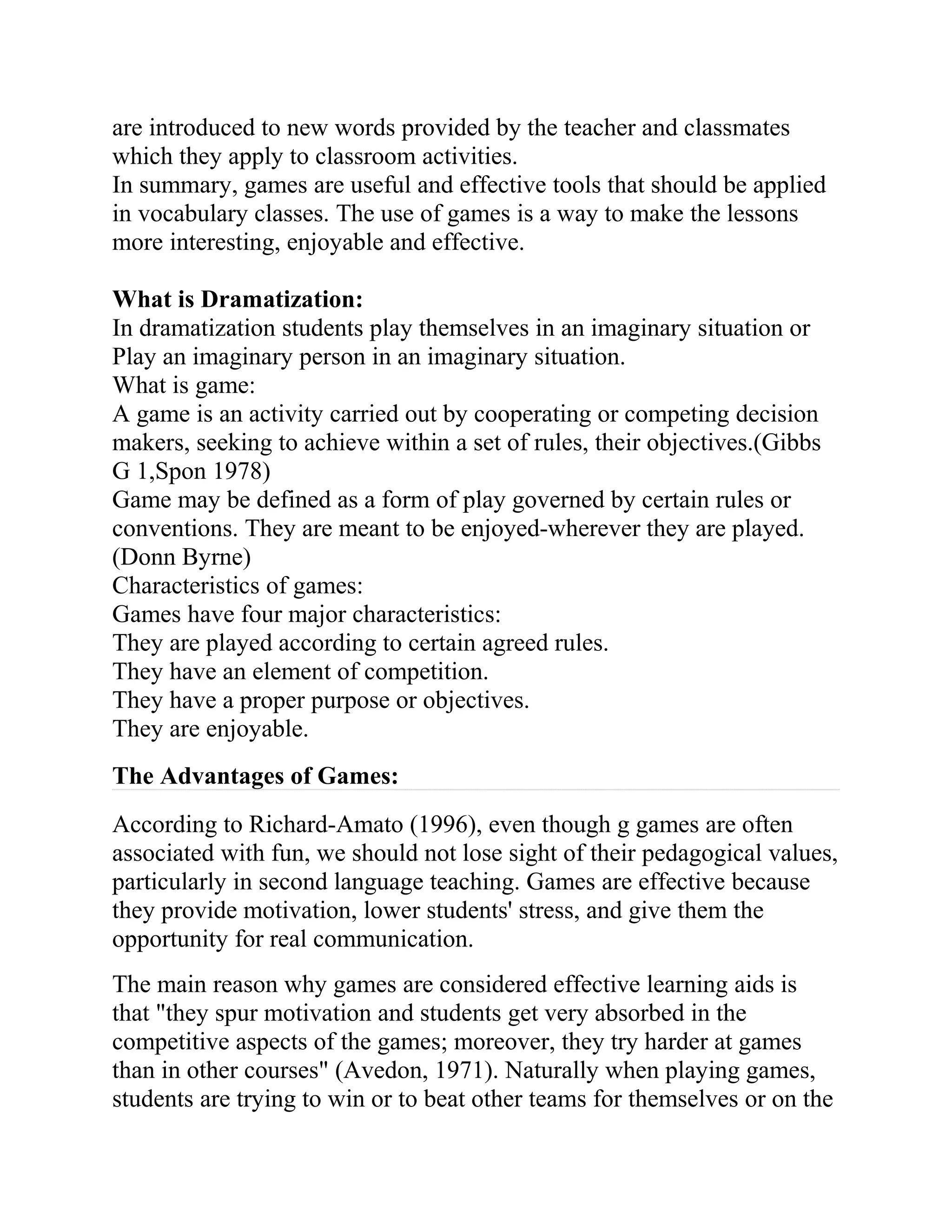 Games are effective language learning tools that motivate students and reduce stress. They allow students to practice language skills in a low-pressure environment where they are focused on the game rather than grammar mistakes. Some benefits of games include increasing student participation, improving fluency as students communicate without stressing about errors, and providing opportunities for real-world language practice. The document provides examples of vocabulary, grammar, and other games that integrate language skills like speaking, reading, and listening in a fun, engaging way for students.