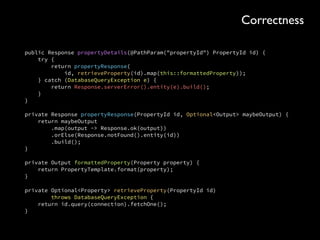The document discusses the importance of readability and efficiency in coding practices, particularly in the context of a property search website. It emphasizes simplifying code by using clear types and reducing redundancy, ultimately advocating for a design approach that aligns with effective software engineering principles. The author reflects on the potential improvements made through better type systems and less complex code structures.